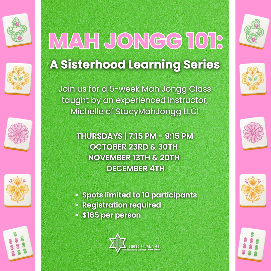 Join us for a 5-week Mah Jongg Class taught by an experienced instructor, Michelle of StacyMahJongg LLC — perfect for beginners or anyone looking for a refresher!