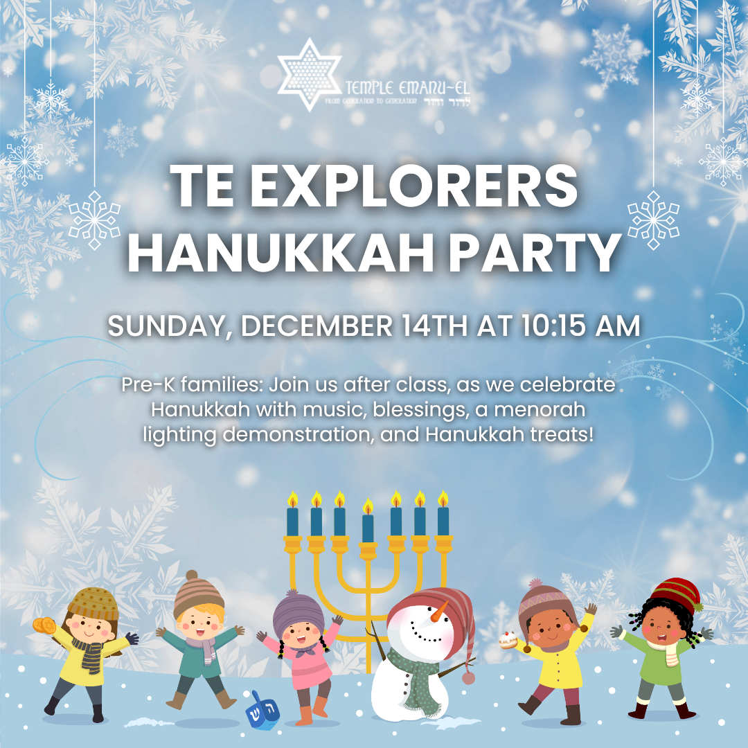 Pre-K families: Join us after class, as we celebrate Hanukkah with music, blessings, a menorah lighting demonstration, and Hanukkah treats!